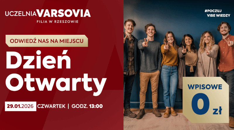 Uczelnia Biznesu i Nauk Stosowanych Varsovia – Filia Rzeszów w czwartek 29 stycznia 2026 roku zaprasza wszystkich zainteresowanych studiowaniem w Rzeszowie na Dzień Otwarty!