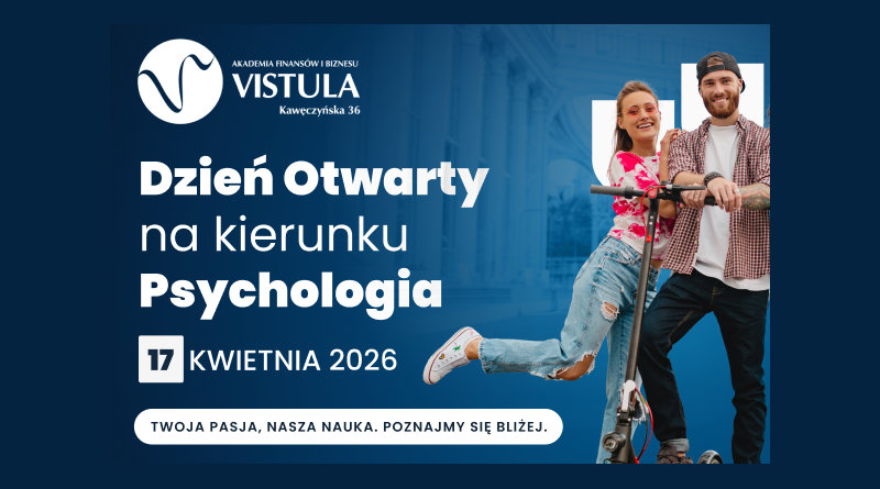 Akademia Finansów i Biznesu Vistula zaprasza na Dzień Otwarty kierunku Psychologia, który odbędzie się 17 kwietnia 2026 r. o godz. 10:00 na kampusie przy ul. Kawęczyńskiej 36 w Warszawie.