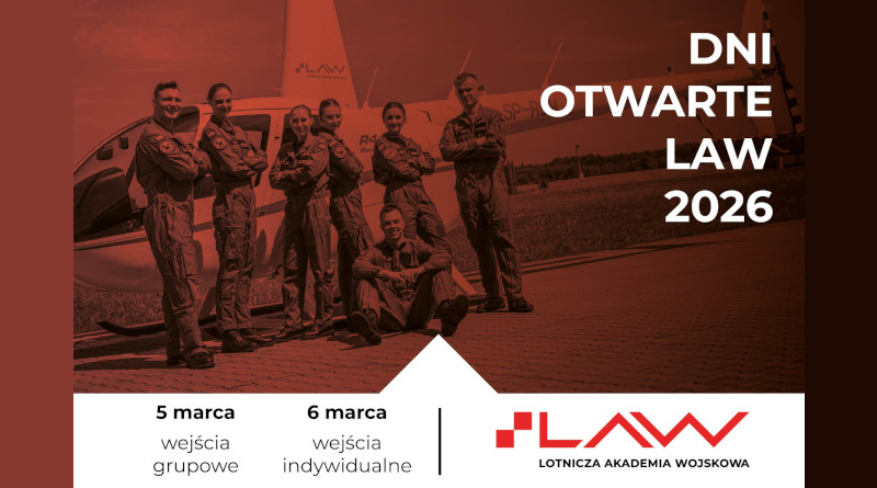 Lotnicza Akademia Wojskowa w Dęblinie w dniach 5-6 marca 2026 roku zaprasza na Dni Otwarte LAW (5 marca – wejścia grupowe, 6 marca – wejścia indywidualne).