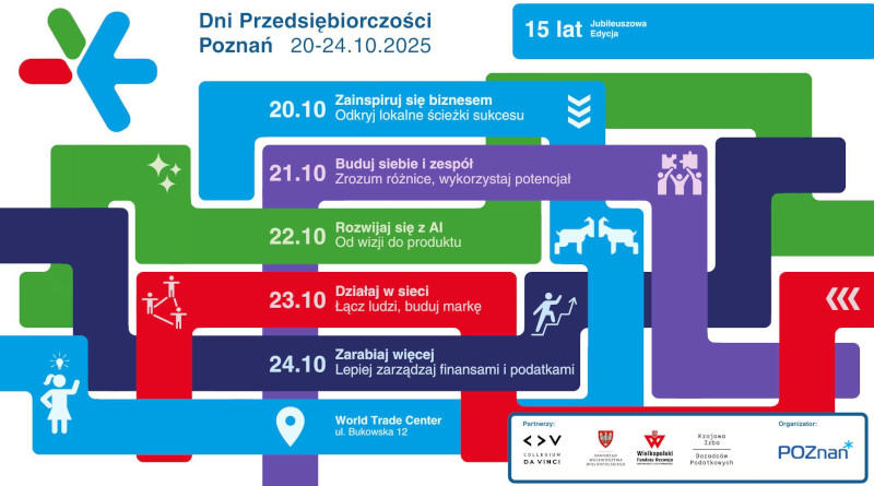 Collegium da Vinci w Poznaniu – partner wydarzenia – zaprasza na Dni Przedsiębiorczości Poznań 2025, które odbędą się w dniach 20-24 października 2025 roku!