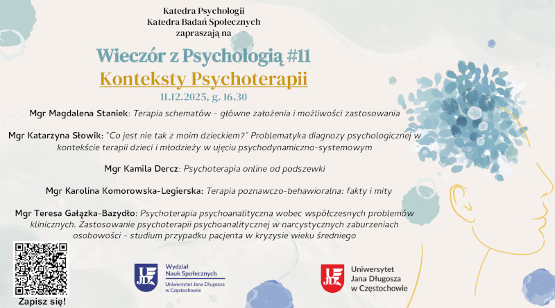 Uniwersytet Jana Długosza w Częstochowie i Wydział Nauk Społecznych UJD zapraszają w czwartek 11 grudnia 2025 roku o godz. 16:30 na sympozjum naukowe online „Wieczór z psychologią – Konteksty psychoterapii„.